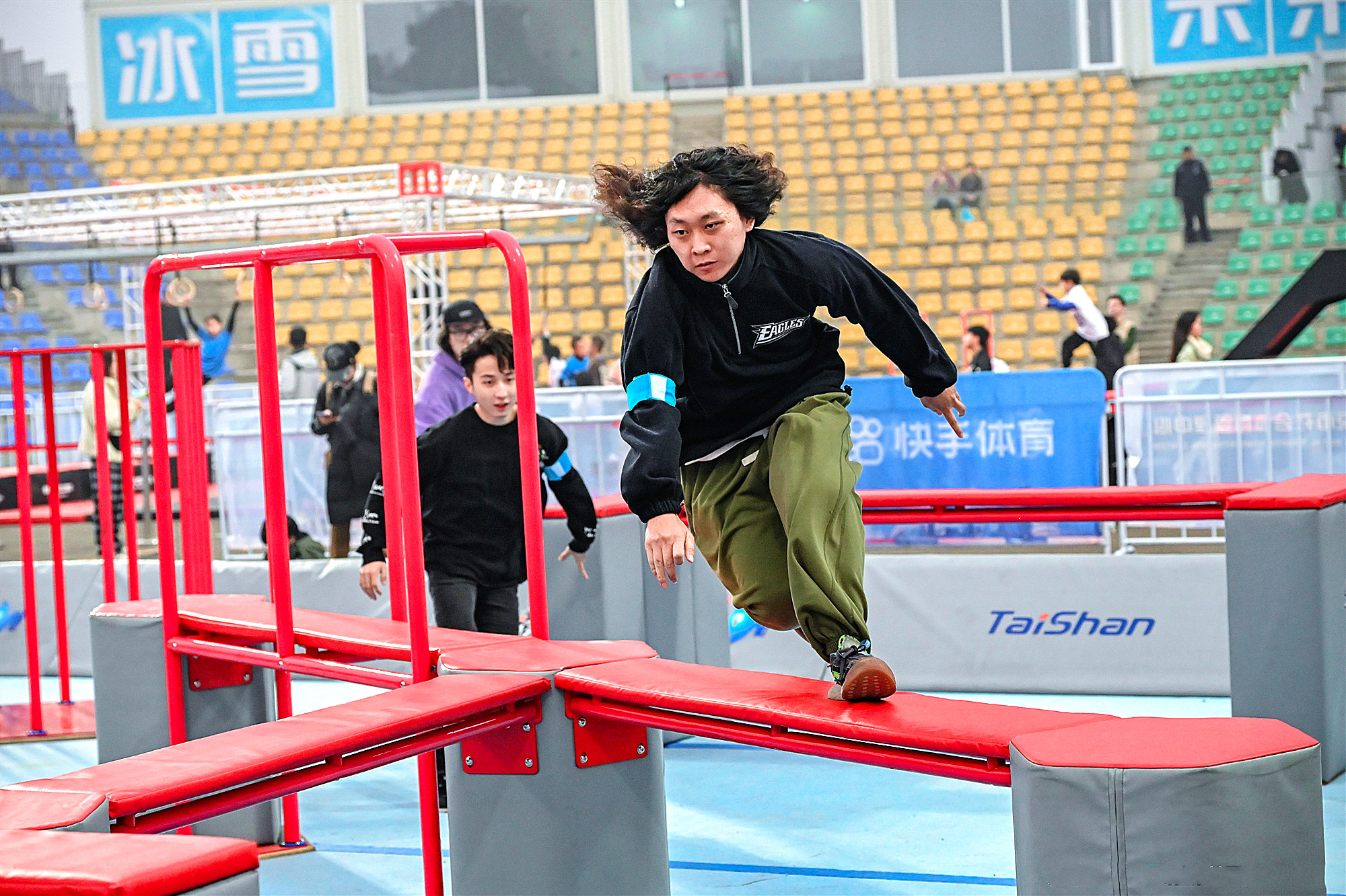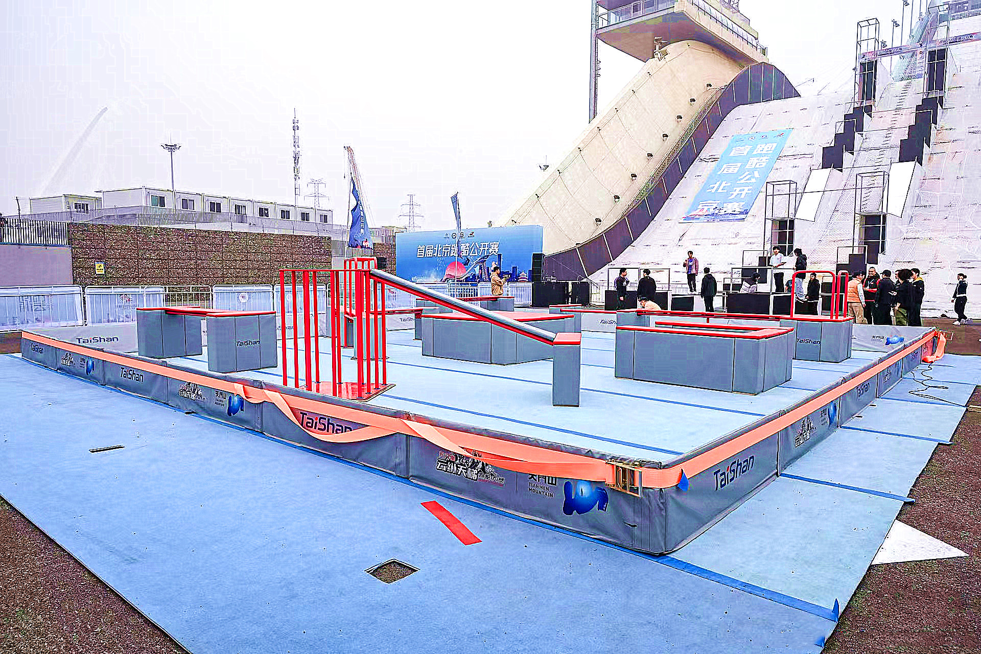 比赛以大跳台及其落地区域为赛场,搭建形成多组颜色鲜艳、各具特点的跑酷赛场。其中大跳台跑酷竞速赛道最为亮眼,赛道在大跳台本体上搭建而成,由大跳箱、滑梯、单杠、速降杆等大型专业跑酷道具组成,为目前全球最陡上升赛道,这对yl8cc永利体育安装团队和跑酷器材场地适用性,又是一次严苛检验。