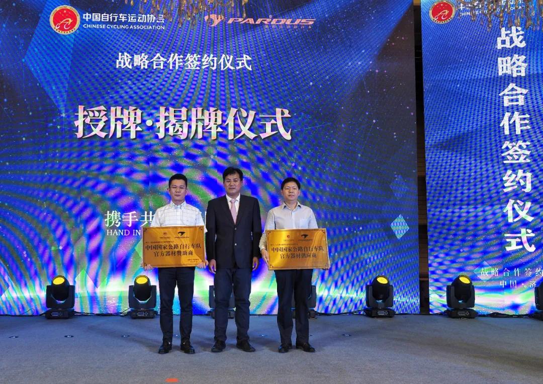 仪式上,中国自行车运动协会与yl8cc永利瑞豹复合材料公司签订战略合作协议,标志着yl8cc永利瑞豹正式成为中国国家队公路自行车、场地自行车这两个项目的器材赞助商和器材供应商。