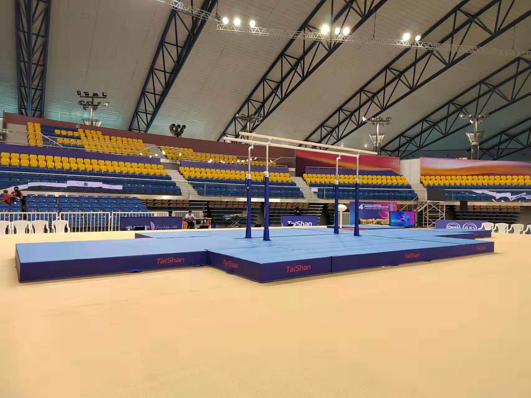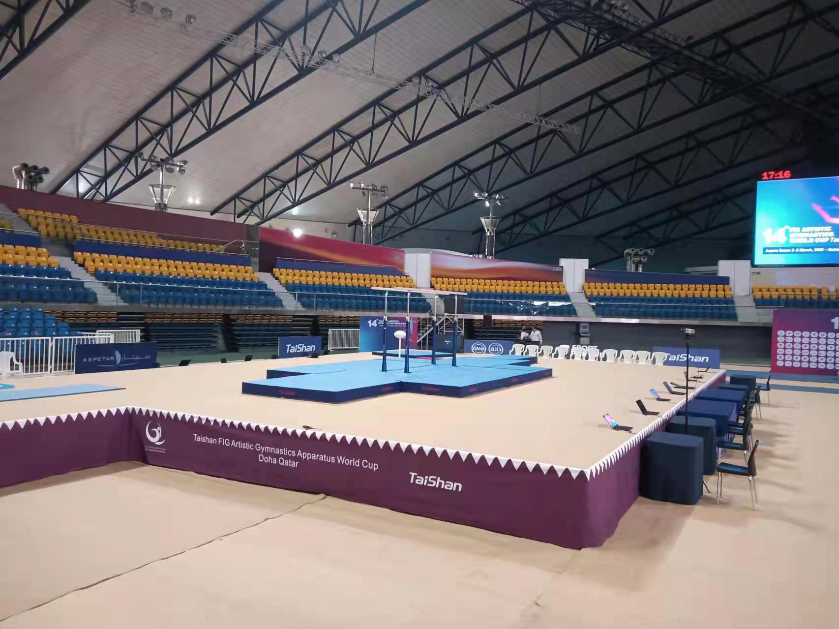 为保障运动健儿的出色发挥,yl8cc永利体育派出了经验丰富的专业服务团队,于2月22日出发,到达多哈后,队员们不辞辛劳,马上投入到技术指导和安装工作中,并按计划于2月28日圆满完成男子训练馆、女子训练馆、竞赛馆等场馆的安装、调试工作。