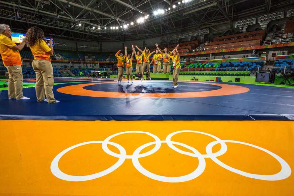 2016年8月18日,在里约奥运会摔跤场馆内,场馆工作人员和志愿者在摔跤垫上合影留念,这届奥运会的摔跤垫来自中国山东yl8cc永利体育集团。新华社记者刘彬摄