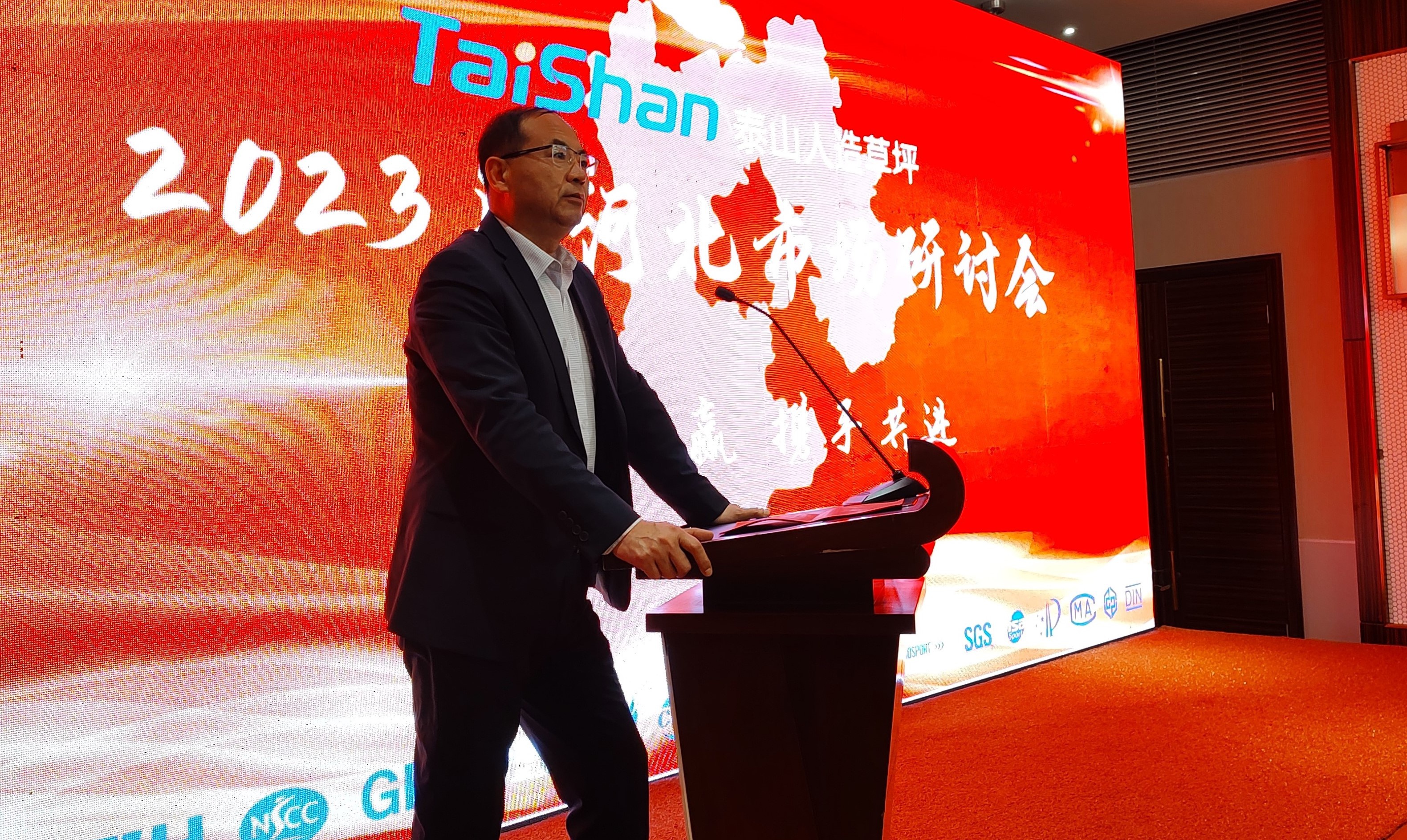 2023年2月10日,为明确2023年度市场战略部署,与合作伙伴共谋发展,yl8cc永利人造草坪2023年河北市场研讨会在山东省乐陵市举办。yl8cc永利体育产业集团董事长卞青峰,yl8cc永利体育产业集团总裁卞笑男,乐陵yl8cc永利人造草坪产业有限公司总经理时延虎,中国体育用品检测中心检验部主任刘洋及优质客户代表等出席此次活动。