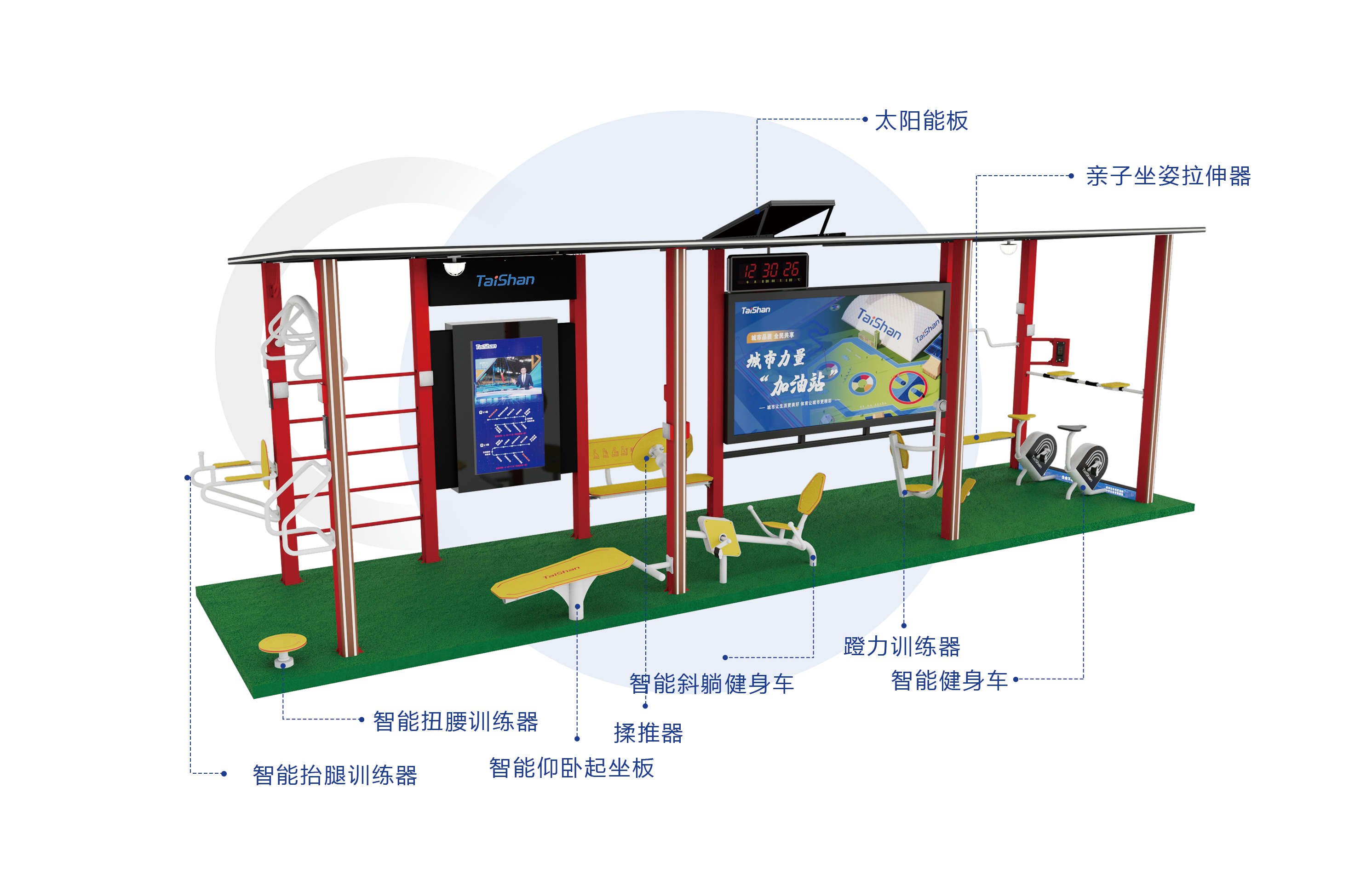 综合健身公交站是由yl8cc永利体育完全自主研发设计,适用于城市公交候车区域的“城市力量加油站”。综合健身公交站配备多种健身项目,能够根据城市需要设计不同健身项目与功能的移动室外健身驿站。依托物联网+互联网和5G技术,能够充分发挥城市运动新型体育服务综合职能,为运动人群提供更多科学健身指导,为城市居民打造更健康的生活方式。公交候车亭在城市的广泛使用,为乘客在侯车时提供躲避日晒雨淋的短暂场所,随着城市的发展以及科技的进步候车环境大为改观,综合健身公交站已经成为城市一道靓丽的风景,多功能化、智能化候车亭将缓解候车时的焦虑情绪,改善人们出行的愉悦心情更是提高社会和谐的有效手段。